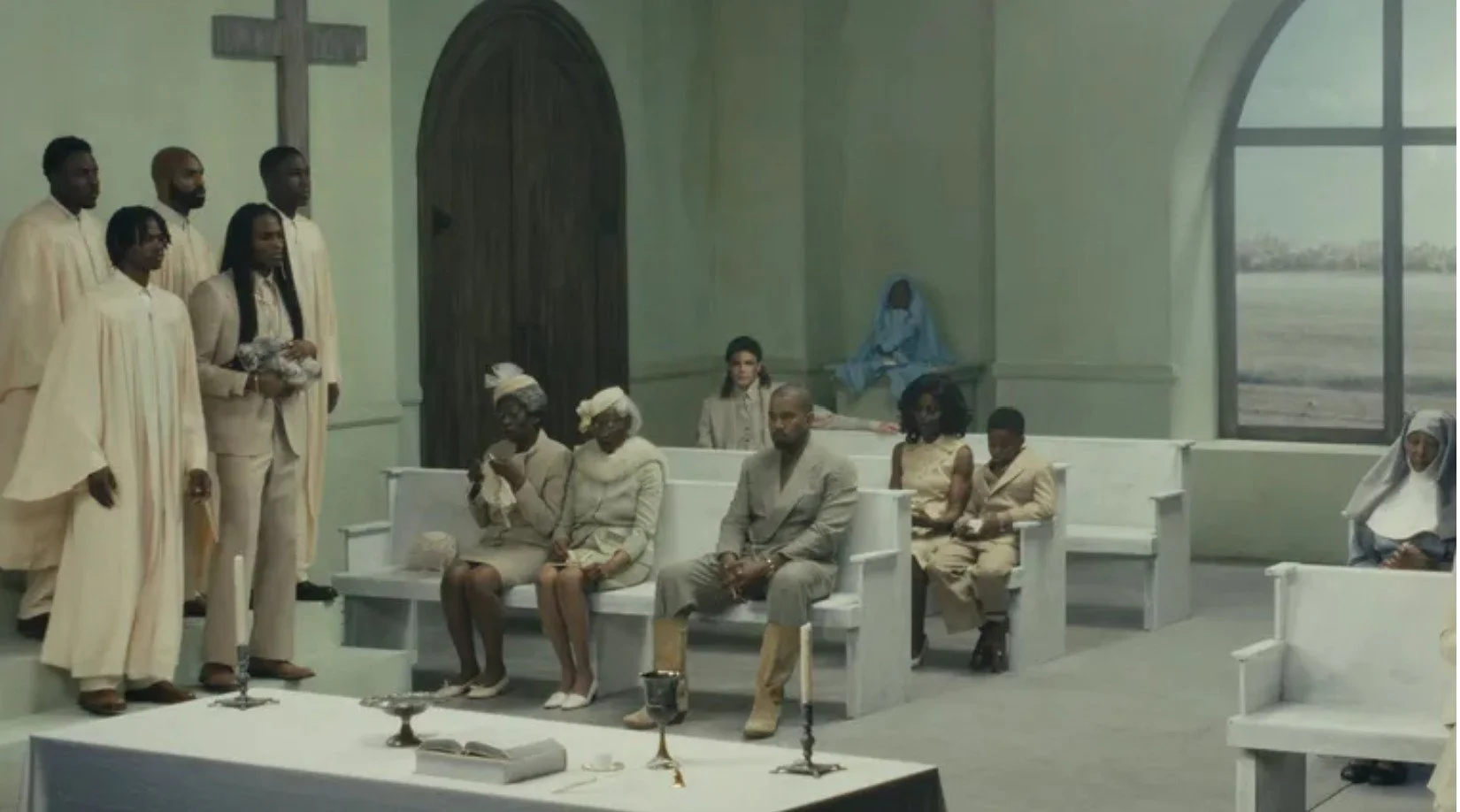 Ye in the pews. Present but elsewhere. A still from "Father," directed by Bianca Censori. March 2026.