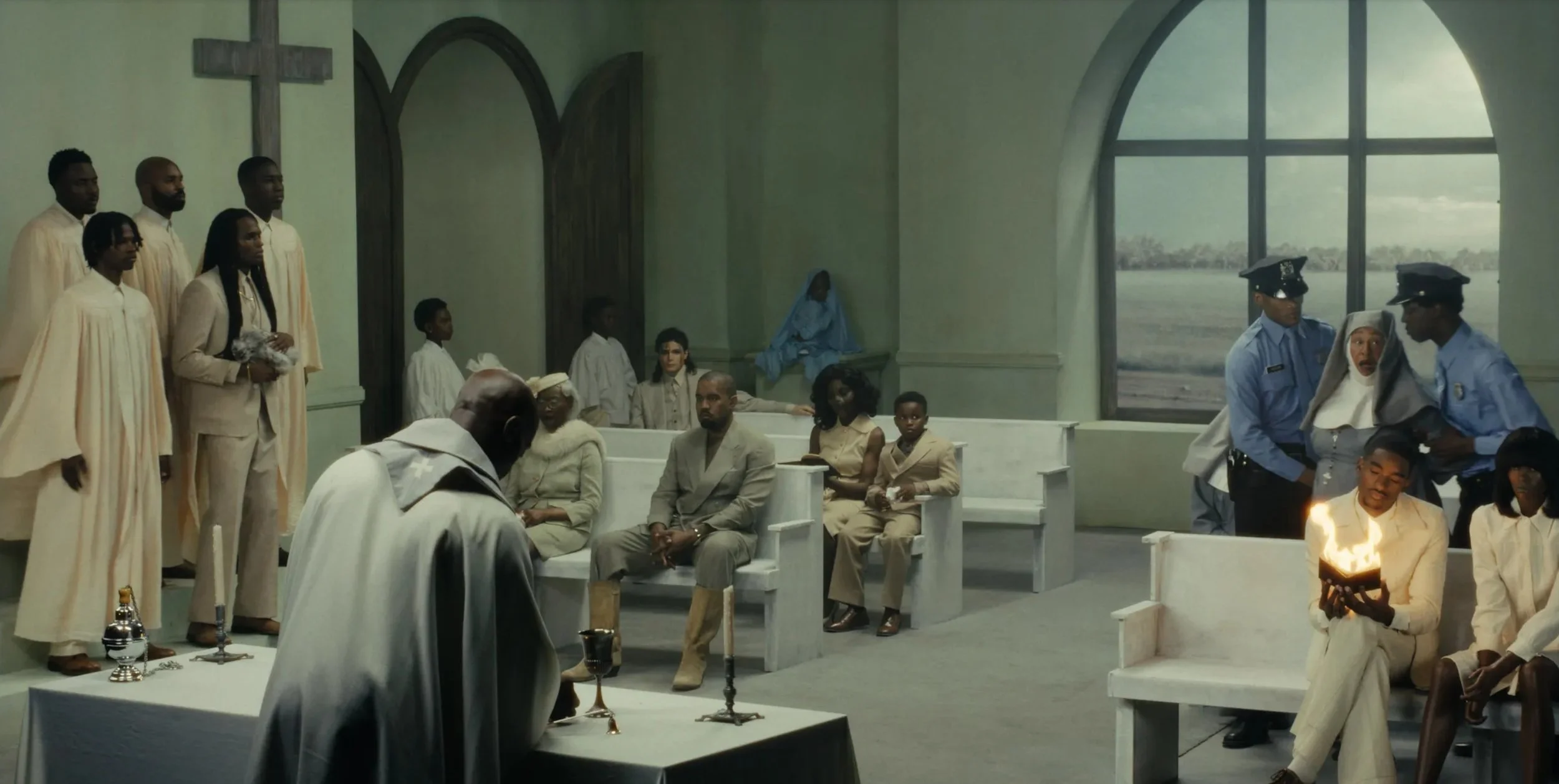 Ye sits in the pews. Present but elsewhere. His thousand-mile stare — the one that has been photographed ten thousand times — is here exactly where it should be, because the film is partly about men who are physically in the room while being spiritually absent from it. Travis Scott performs his verse with the confidence of someone who has never questioned his right to take up space.